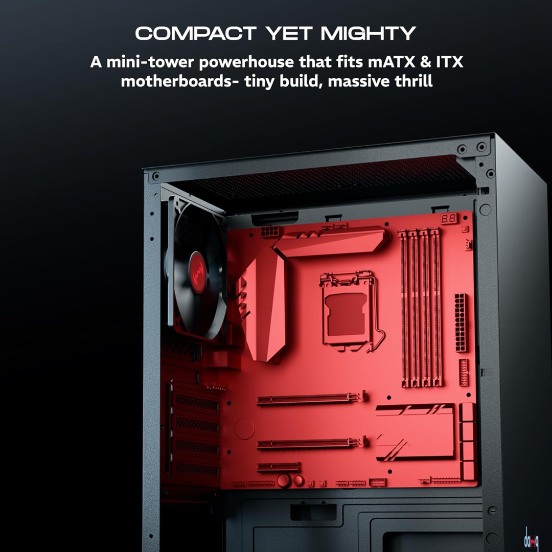 Experience power in a compact form with the daWg V Series 110 Mini-Tower Gaming Cabinet. Designed for mATX and Mini ITX builds, it offers excellent airflow with a pre-installed 120mm rear fan and supports GPUs up to 280mm. With flexible storage options, 4 PCIe expansion slots, and easy connectivity through USB 3.0 and audio ports, this sleek grey chassis combines performance and style for modern gaming setups.